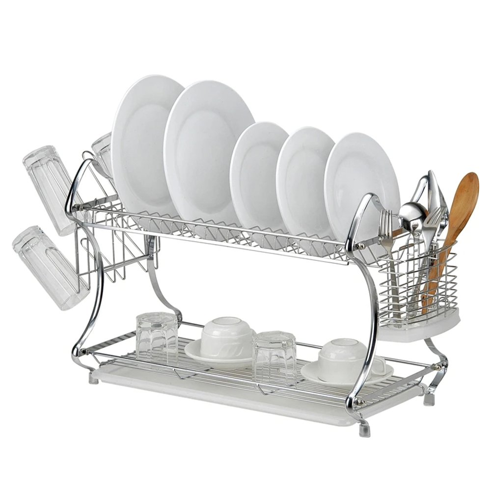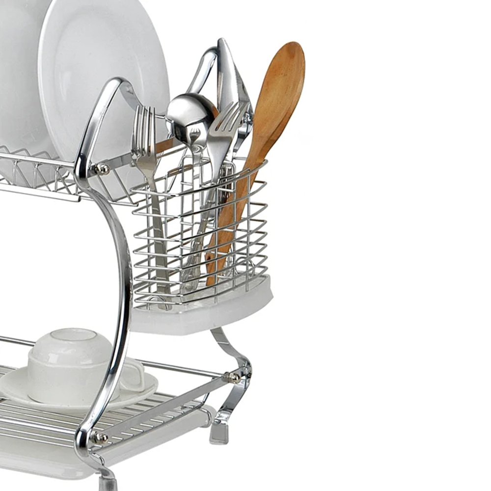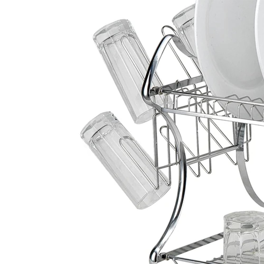 This dish rack offers a versatile and efficient solution for drying your dishes. With its 2-tier design, it provides ample space for organizing plates, bowls, and utensils. Additionally, it features a cup drainer and a strainer, enhancing its functionality for various kitchen tasks. The included glass holder and cutlery holder further optimize space utilization, while the drainer tray effectively prevents excess water from accumulating, keeping your countertop clean and dry. Say goodbye to cluttered countertops and hello to organized dish drying with this convenient and practical dish rack.