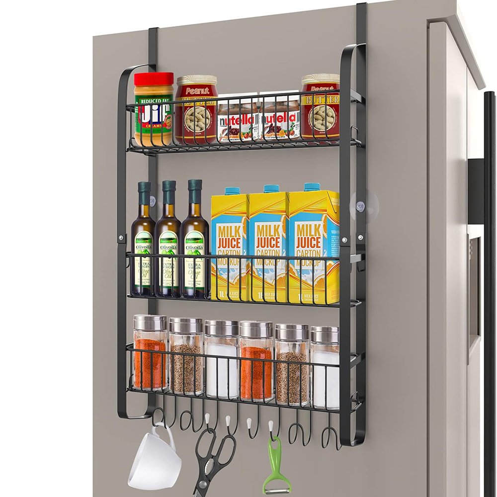 The first and second layer: you can put soy sauce, vinegar and cooking oil.The third layer: you can put pepper, salt and other condiments.The fourth layer hooks : can store spoons, bottle openers, colanders and cups, an auxiliary sticker is provided, which is stable and does not fall off.