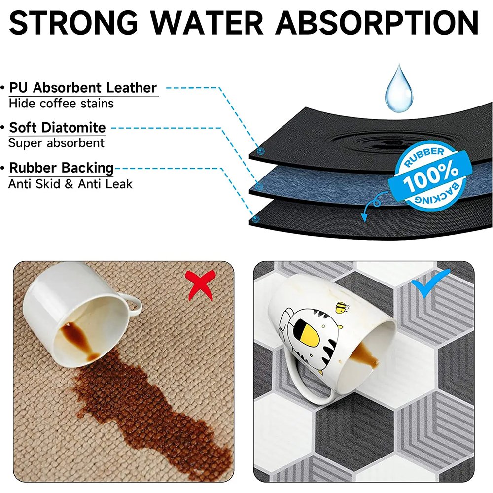 The drying pad is made of super absorbent material, which can quickly absorb residual water droplets, milk and coffee; the breathable honeycomb structure can quickly evaporate water, keeping the kitchen countertop drying for a long time.