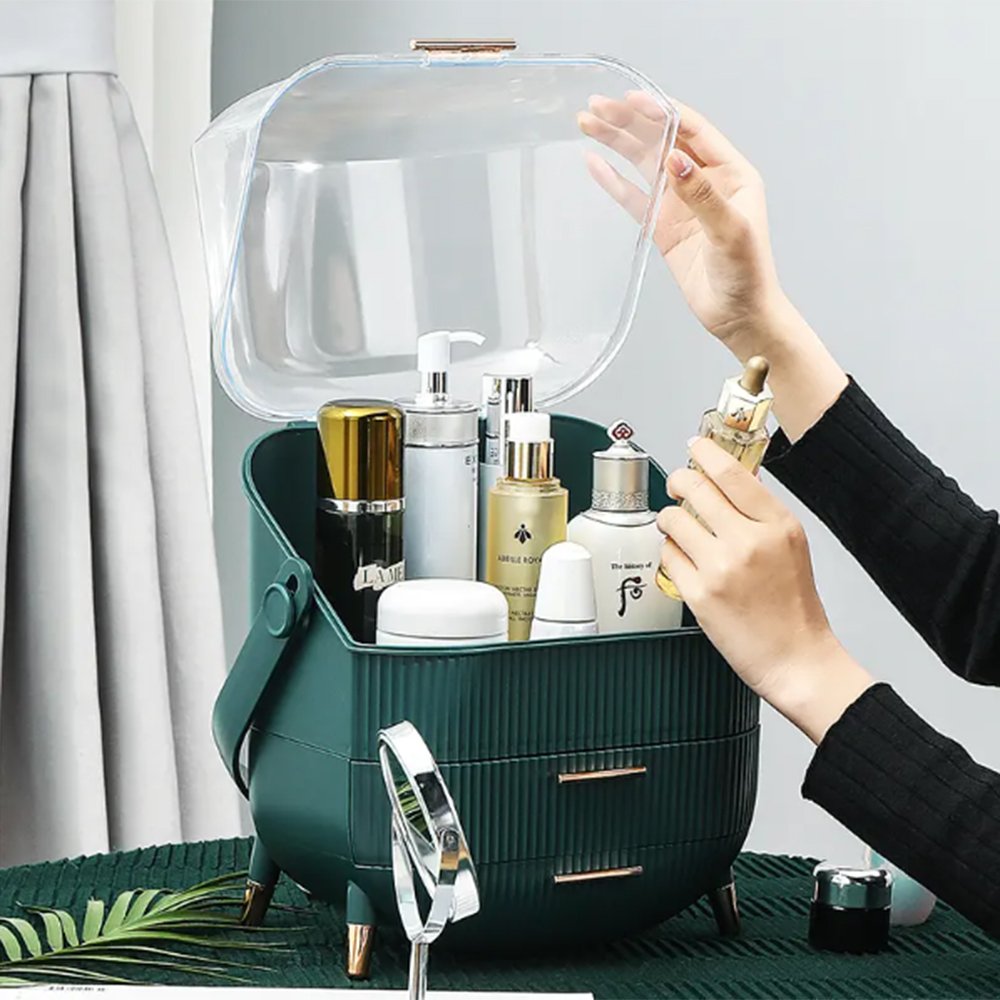 The top transparent shell accommodates approximately 12 tall bottles, while two spacious drawers offer ample space for cosmetics, skincare products, lipsticks, and jewelry.