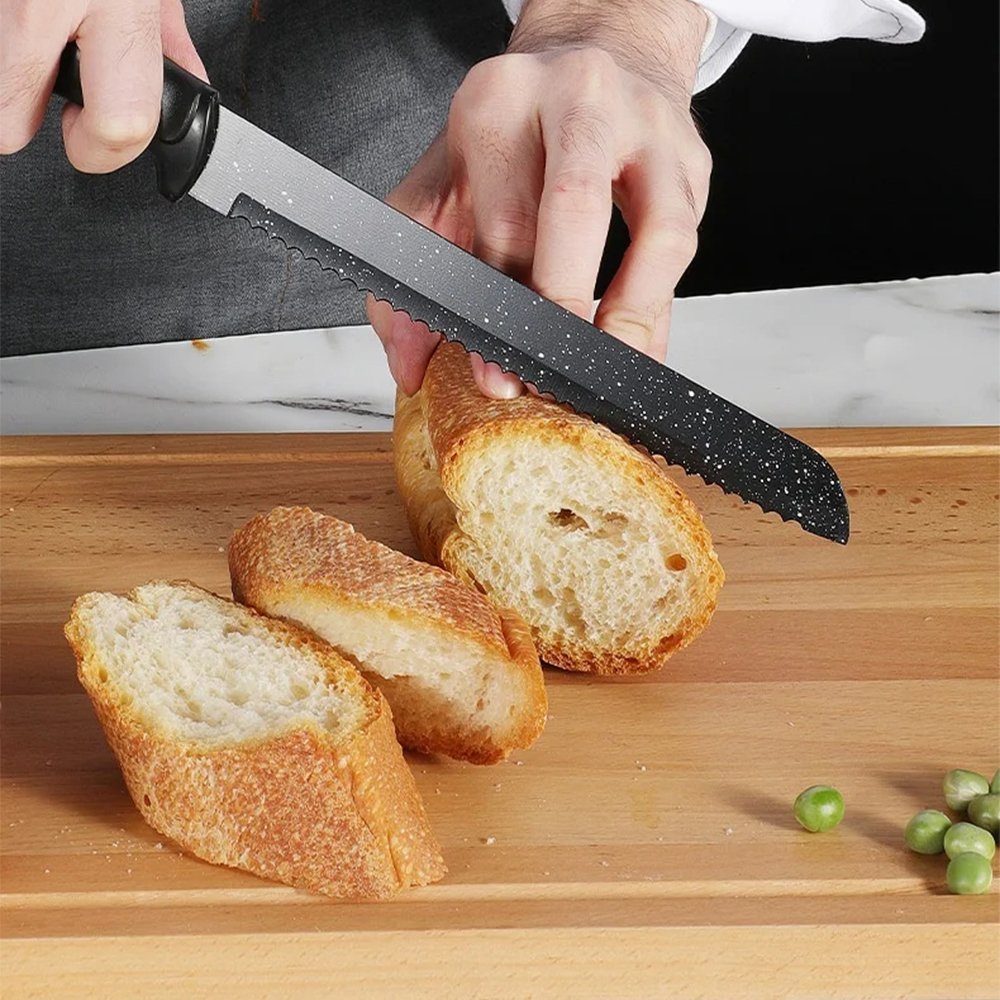 -A perfect mix of practicality, featuring knives for all purposes:Peeler, slicer knife ,Bread knife, Meat knife, Chef’s knife and fruit knife. A set of knives meets the general needs of kitchen knives.