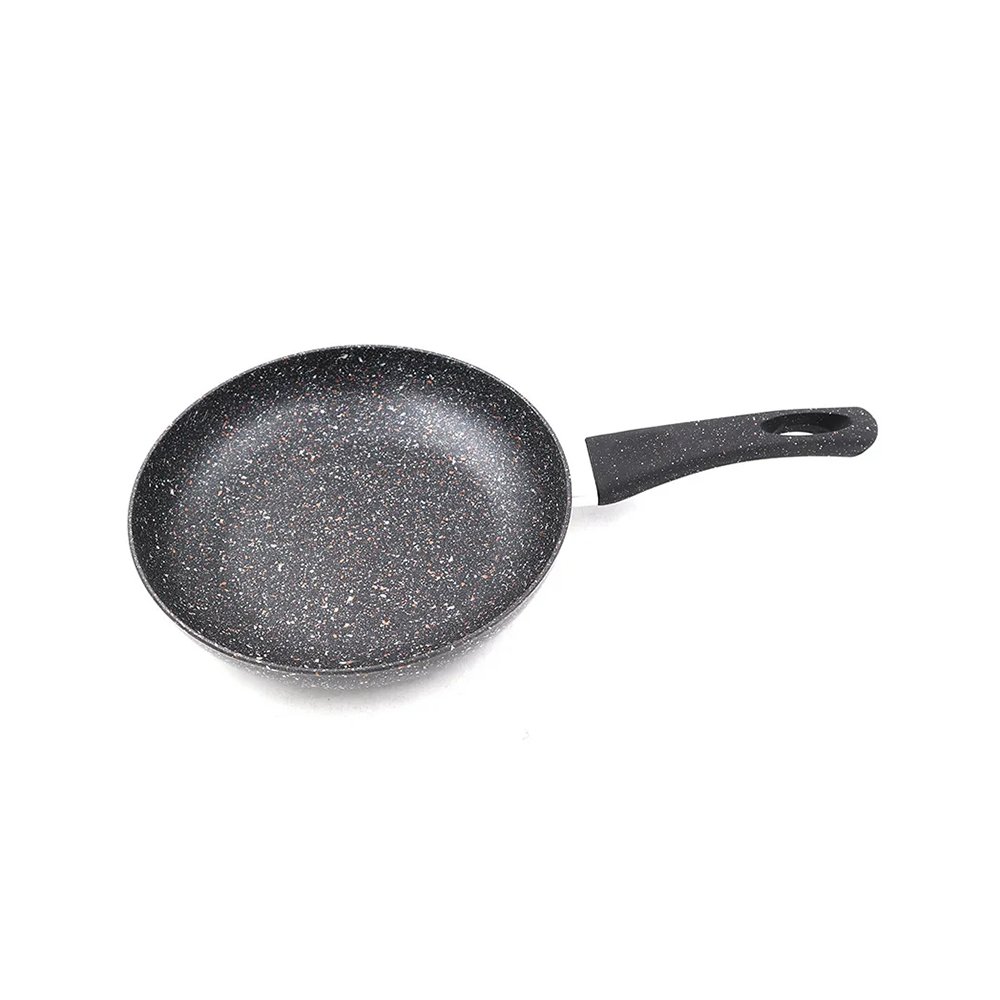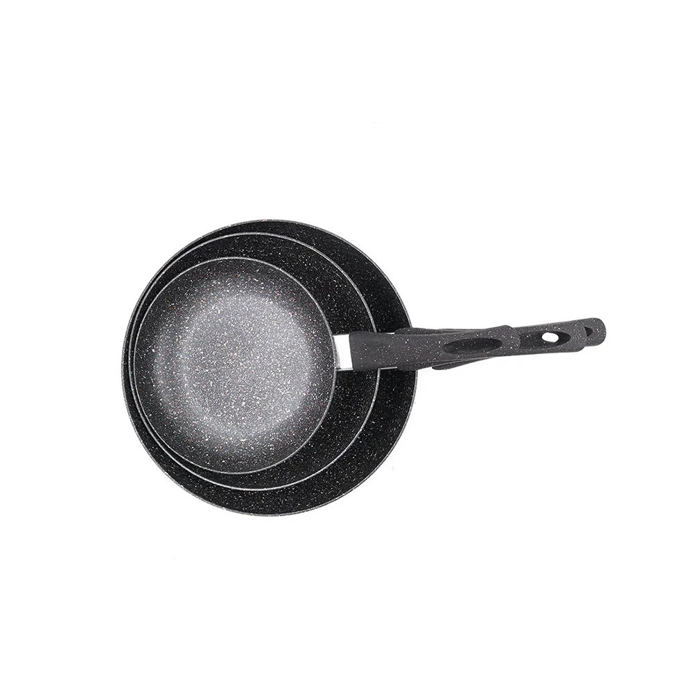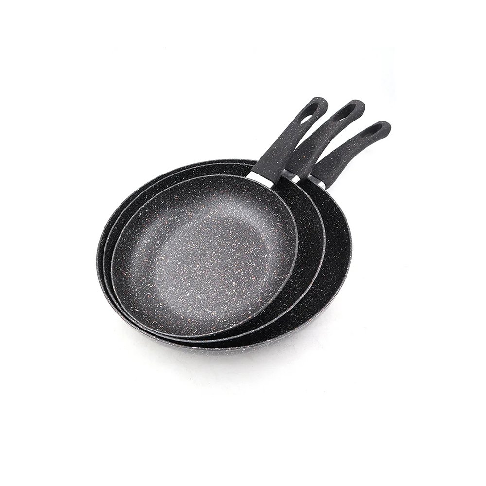 This frying pan set has an interior coated with a non-stick material for easy food release and cleaning. It’s equipped with a long black heat-resistant handle that stays cool while cooking on the stove. Designed to lie flat on the surface, its size makes it ideal for cooking omelets, pancakes, or stir-fried vegetables for one or two people. The set is also dishwasher safe for easy cleaning and is compatible with all types of stoves.