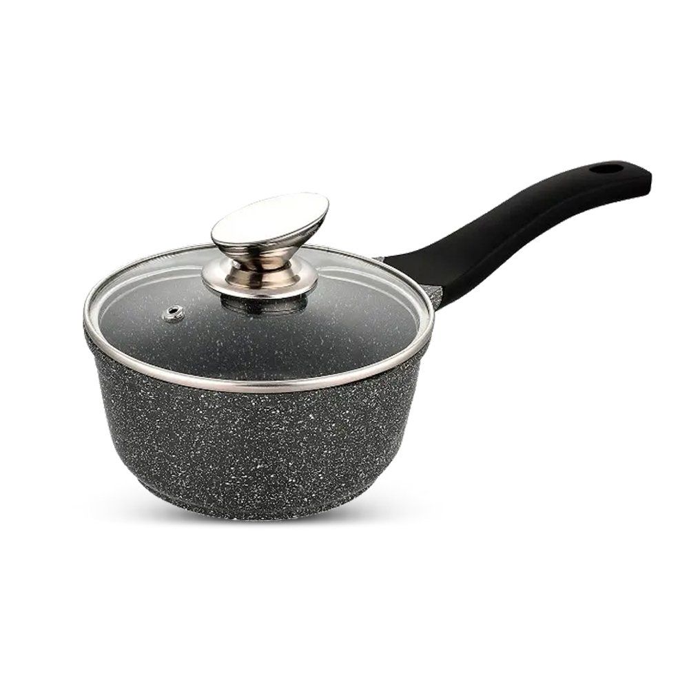 This frying pan set has an interior coated with a non-stick material for easy food release and cleaning. It’s equipped with a long black heat-resistant handle that stays cool while cooking on the stove. Designed to lie flat on the surface, its size makes it ideal for cooking omelets, pancakes, or stir-fried vegetables for one or two people. The set is also dishwasher safe for easy cleaning and is compatible with all types of stoves.