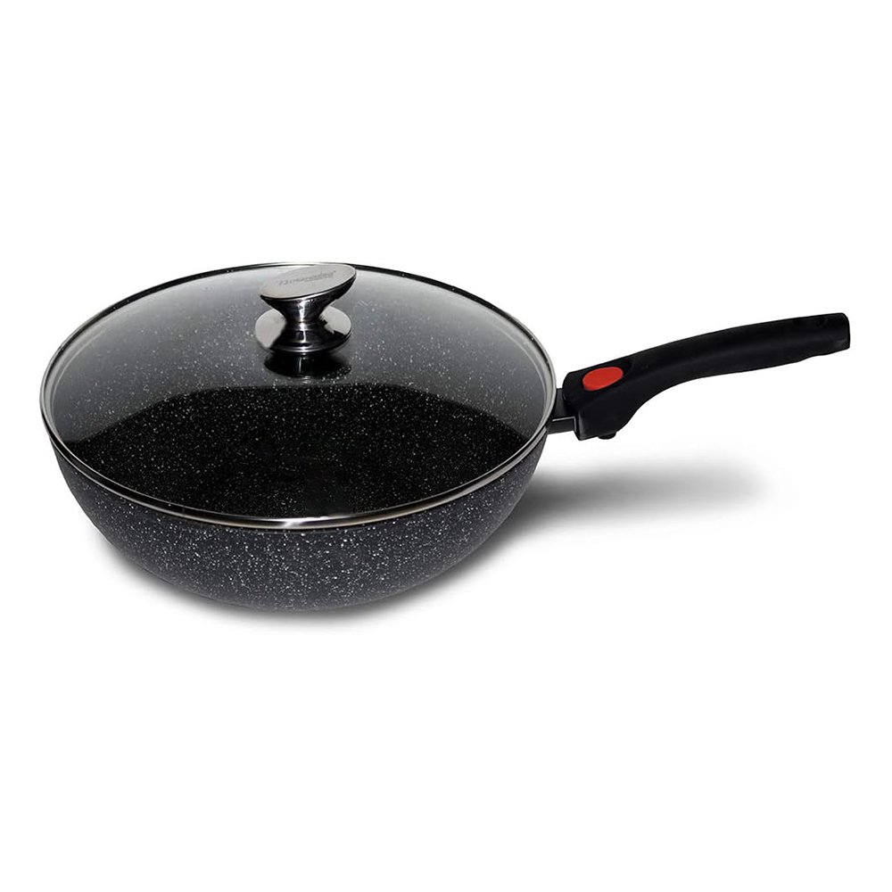 This frying pan has an interior coated with a non-stick material for easy food release and cleaning. It’s equipped with a removable long black heat-resistant handle that stays cool while cooking on the stove. Designed to lie flat on the surface, its size makes it ideal for cooking omelets, pancakes, or stir-fried vegetables for one or two people. The set is also dishwasher safe for easy cleaning and is compatible with all types of stoves.