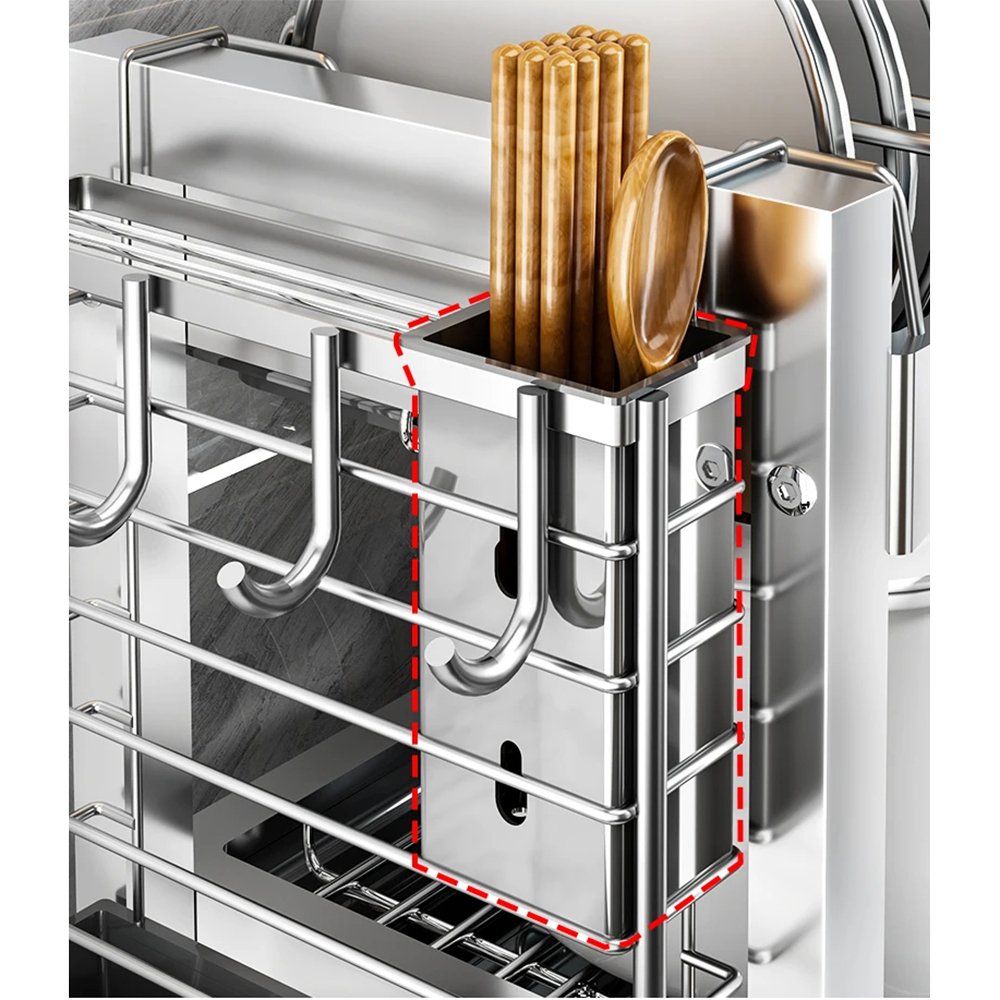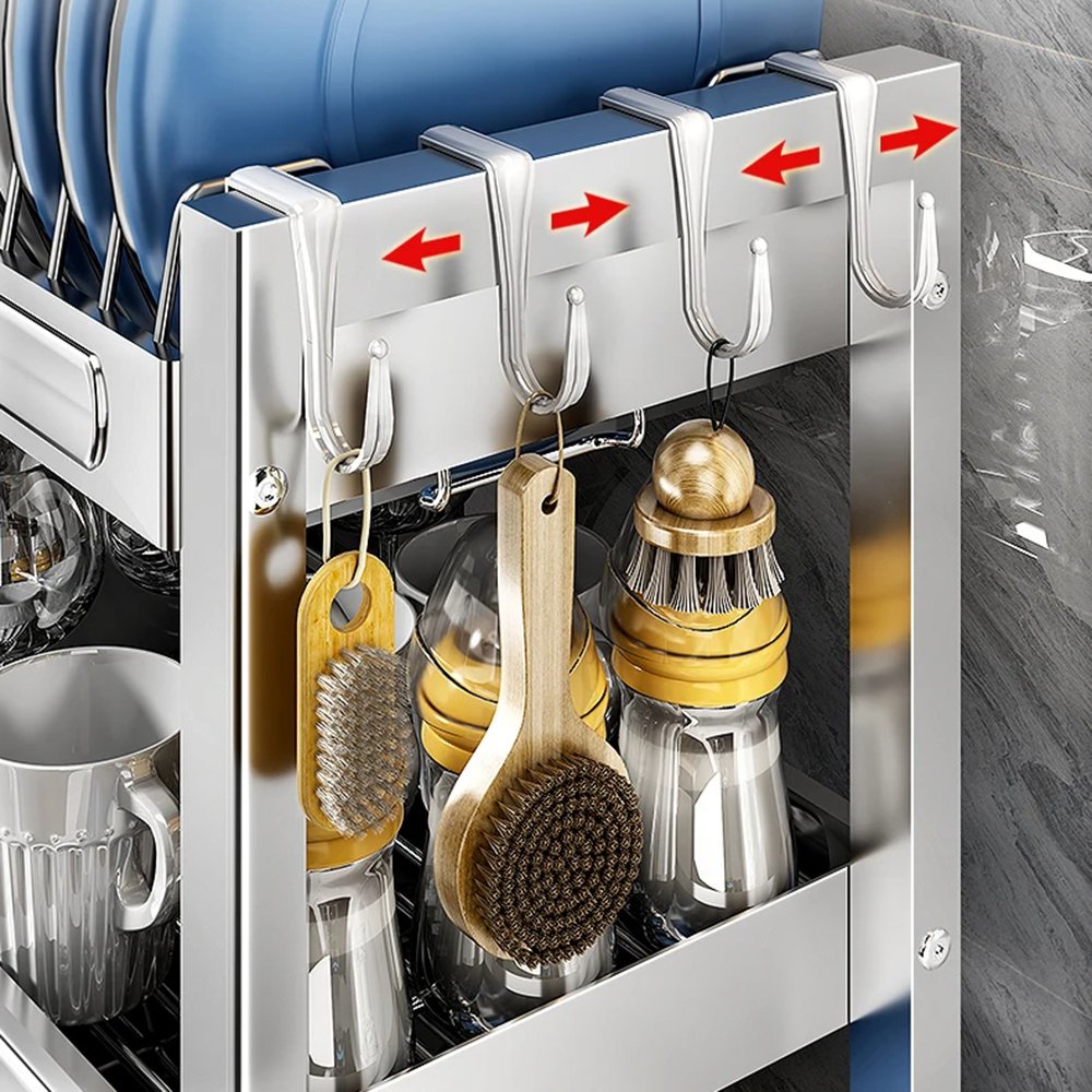 Upgrade your kitchen organization with a three-tier dish rack featuring a built-in drainboard and a convenient hanging cut board section. Crafted to resist rust and ensure long-lasting durability, this dish drying rack is designed to efficiently air-dry your dishes while keeping your countertop clutter-free. Its three-tier design maximizes space utilization, making it perfect for homes with limited kitchen space. With its sleek and practical construction, this dish rack is an essential addition to any kitchen, providing both functionality and style.