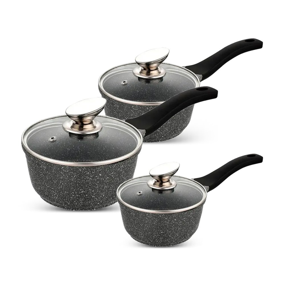 Ergonomic handles ensure a comfortable and secure grip, while glass lids make monitoring cooking easy.