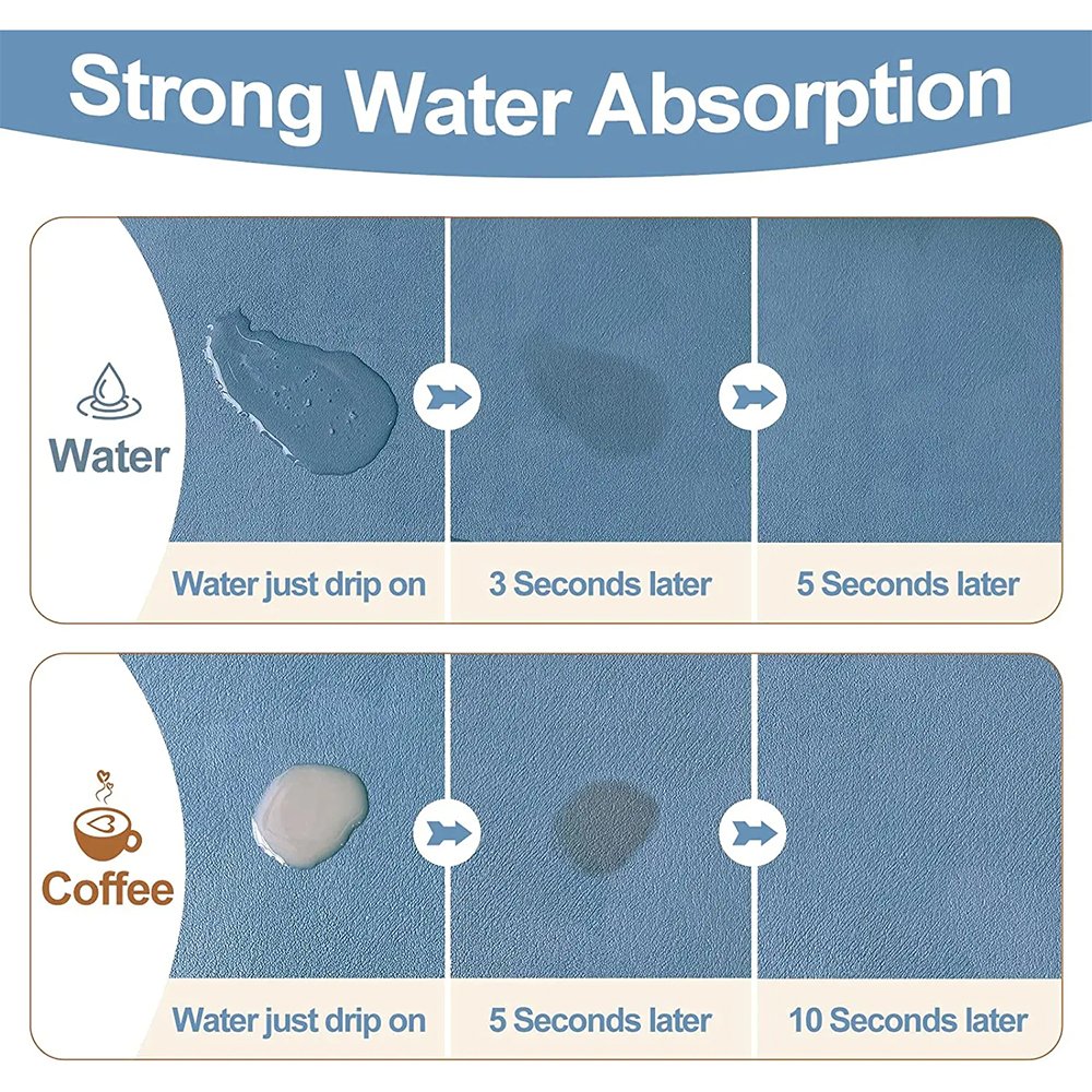 This kitchen drying mat can be placed anywhere you want to absorb water, such as kitchen countertops, dish racks, coffee machines, under sinks, bathroom countertops and dining tables.