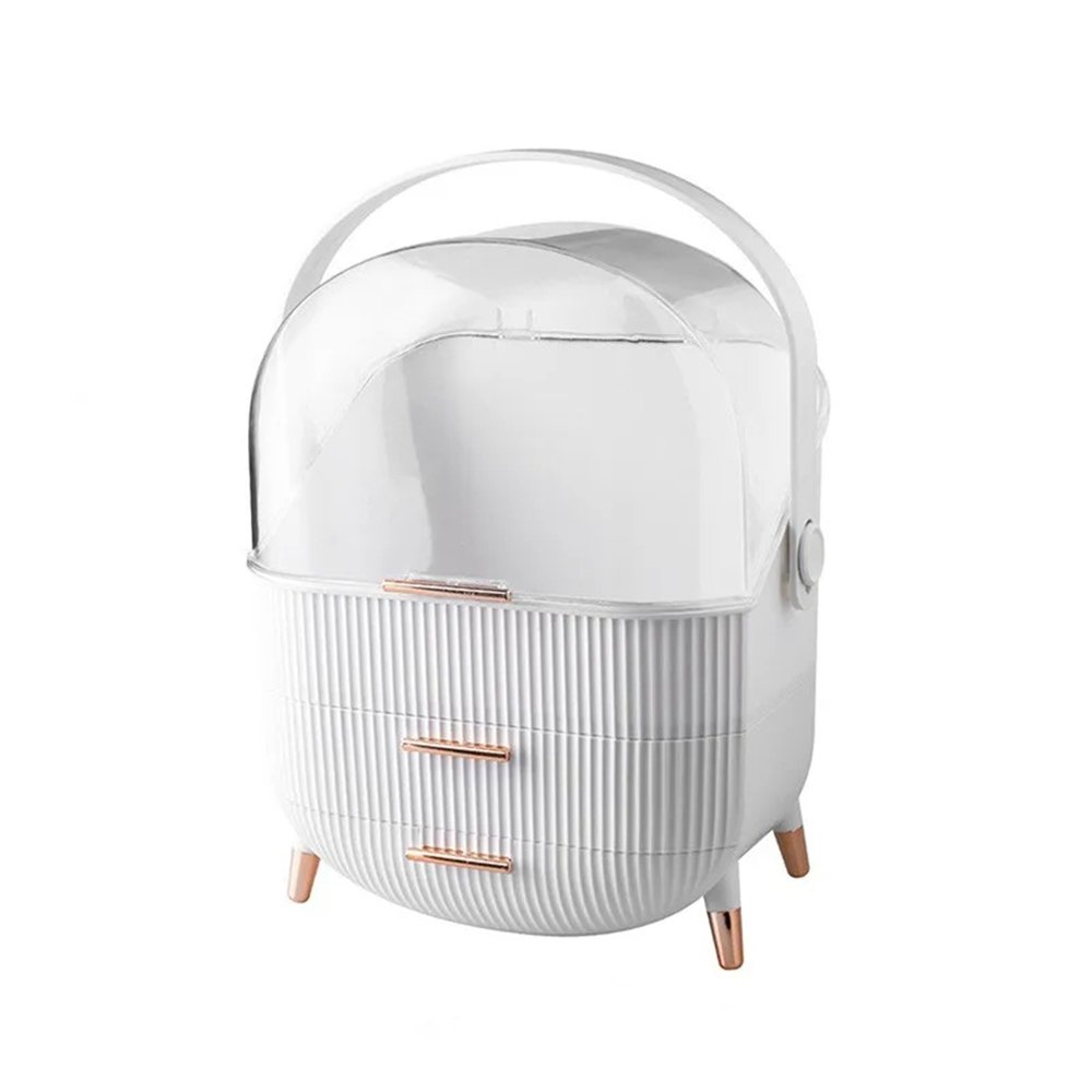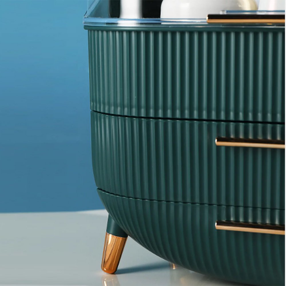 The top transparent shell accommodates approximately 12 tall bottles, while two spacious drawers offer ample space for cosmetics, skincare products, lipsticks, and jewelry.