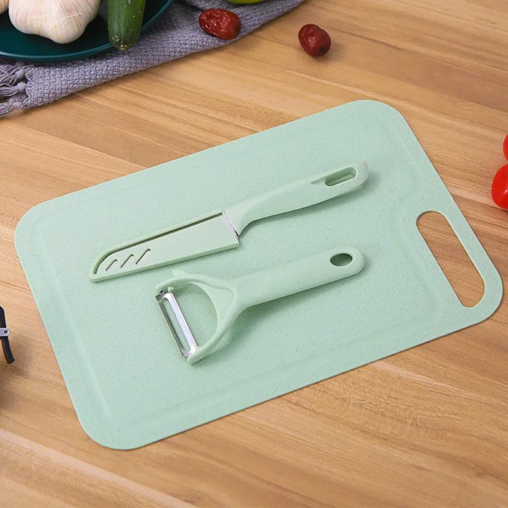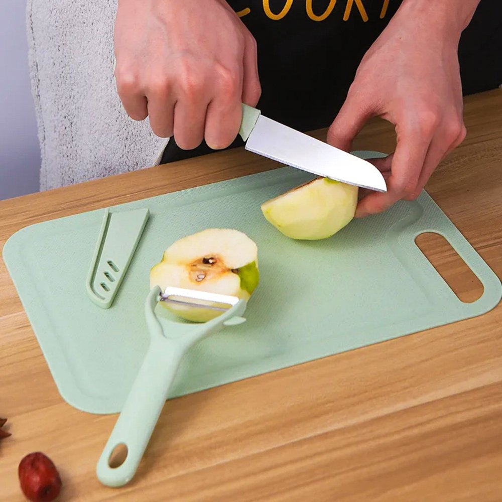 This three-piece kitchen set comprises a knife, cutting board, and peeler, offering essential tools to streamline food preparation tasks. The knife is designed for various cutting and slicing needs, ensuring precision and efficiency. The cutting board provides a stable surface for chopping ingredients, while the peeler facilitates quick and easy peeling of fruits and vegetables. Together, these tools make meal preparation more convenient and enjoyable, whether you're cooking daily meals or preparing elaborate dishes.