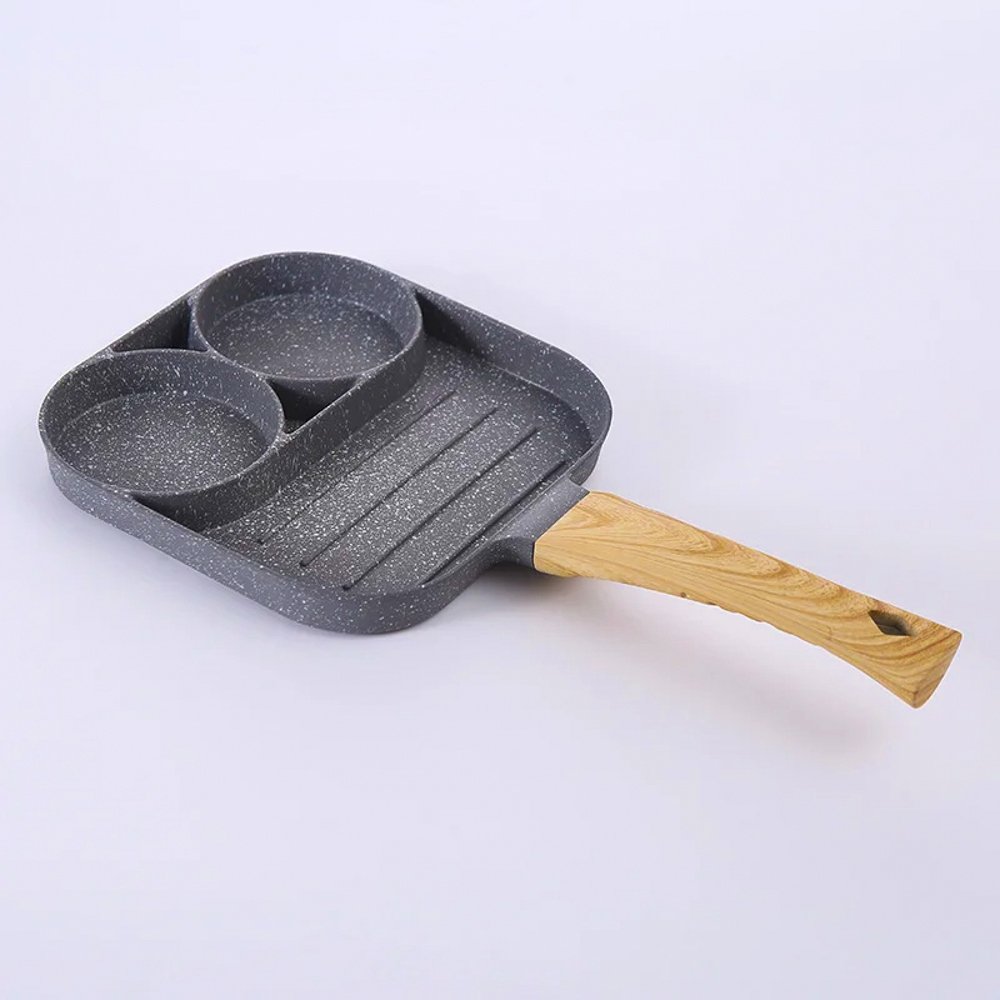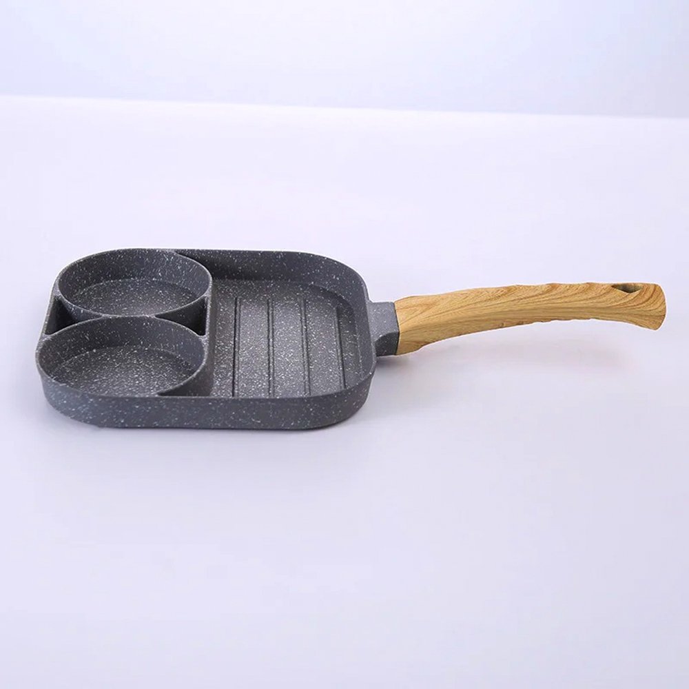 This egg pan is designed with 3 sections, with two round cups and one rectangular section, you can fry eggs, pancakes and steaks separately.