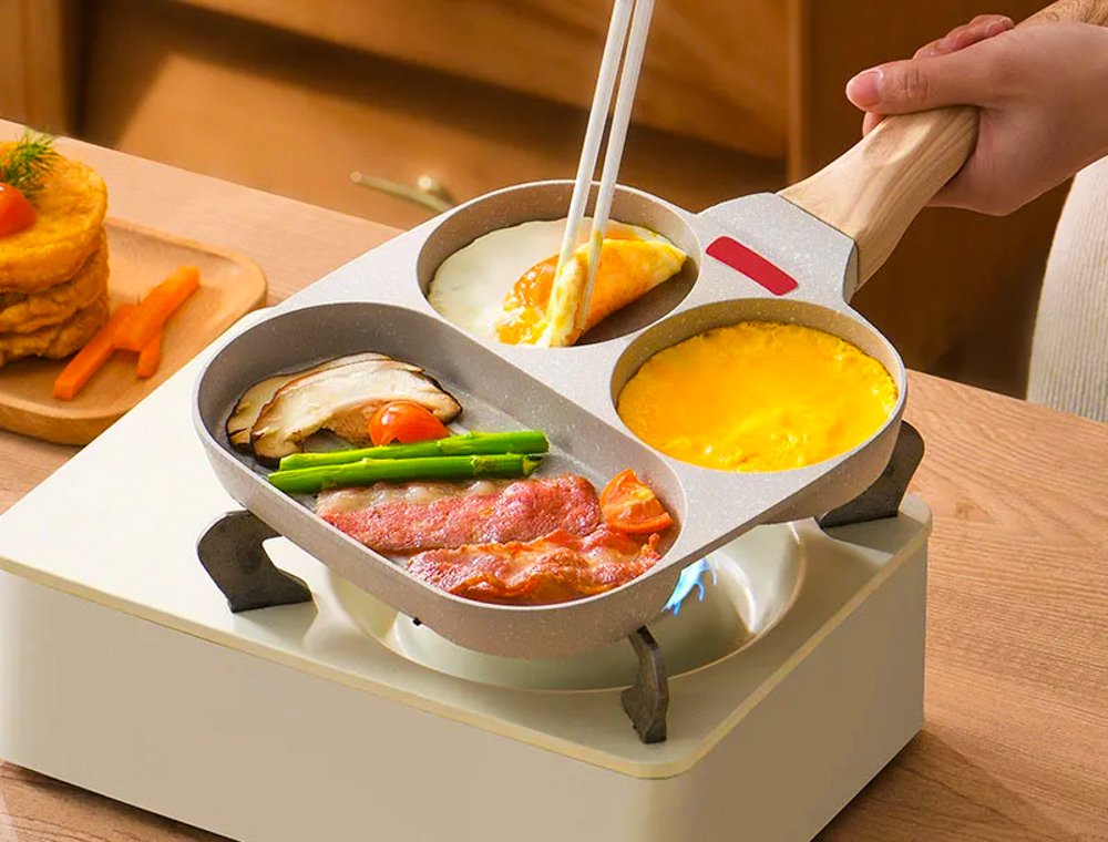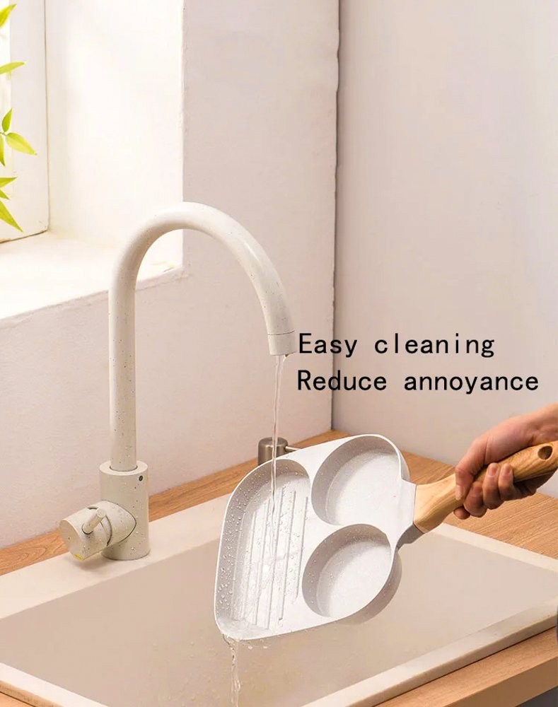 This egg pan is easy to clean and features a comfortable, heat-resistant long handle for safety. The thickened pot body heats up quickly and evenly, ideal for preparing breakfast efficiently. It's a nonstick frying pan suitable for cooking multiple eggs or pancakes at once, compatible with induction cookers and gas stoves.