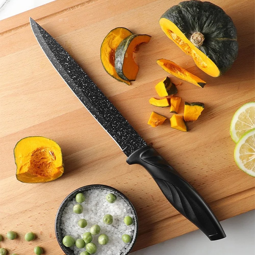 -A perfect mix of practicality, featuring knives for all purposes:Peeler, slicer knife ,Bread knife, Meat knife, Chef’s knife and fruit knife. A set of knives meets the general needs of kitchen knives.