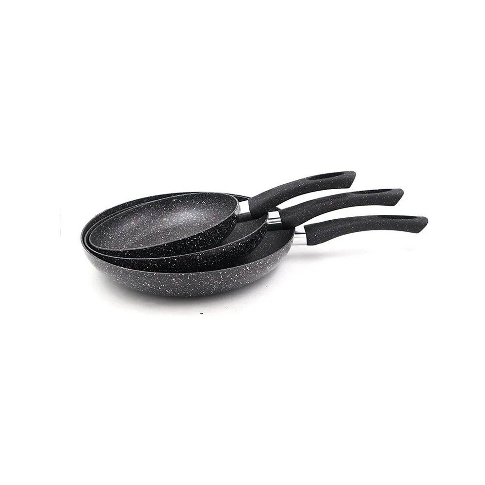 This frying pan set has an interior coated with a non-stick material for easy food release and cleaning. It’s equipped with a long black heat-resistant handle that stays cool while cooking on the stove. Designed to lie flat on the surface, its size makes it ideal for cooking omelets, pancakes, or stir-fried vegetables for one or two people. The set is also dishwasher safe for easy cleaning and is compatible with all types of stoves.