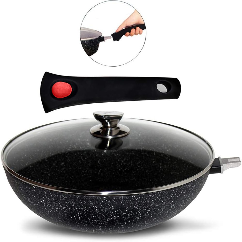 This frying pan has an interior coated with a non-stick material for easy food release and cleaning. It’s equipped with a removable long black heat-resistant handle that stays cool while cooking on the stove. Designed to lie flat on the surface, its size makes it ideal for cooking omelets, pancakes, or stir-fried vegetables for one or two people. The set is also dishwasher safe for easy cleaning and is compatible with all types of stoves.