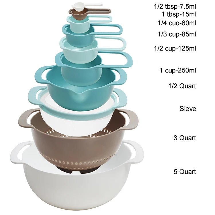 This set includes essential tools such as a large mixing bowl, a practical colander, and a versatile sieve with a net. Additionally, it features a small mixing bowl with measurements for precise ingredient preparation. To ensure accurate measurements, we've included a set of 6 measuring cups, ranging from 1 cup to 1/2 cup, catering to all your cooking and baking needs. Elevate your kitchen experience with this complete set, crafted for convenience, precision, and efficiency.