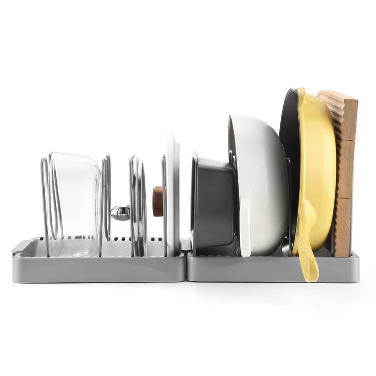 With four adjustable brackets, this organizer can accommodate pots and pans of various sizes, allowing you to customize the storage layout to suit your needs. The innovative buckle design on both sides of the shelf enables seamless combination, ensuring a snug fit within your cabinet space. Say goodbye to cluttered cabinets and wasted space with our Cookware Organizer, providing a convenient and organized solution for storing your cookware with ease.